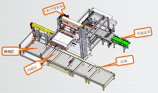 尼為碼垛機系列被用于食品飲料、化工等行業等;適用于各種紙箱、塑箱、膜包及桶類等多種類型包裝件的堆疊,設備主機分為差速皮帶、 轉向機構、排箱區、碼箱區、主體升降機構、出垛滾筒等部分組成。