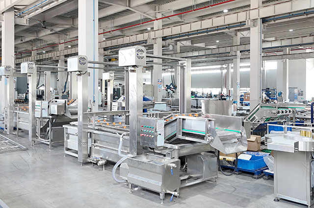 鼓泡清洗-預煮—振動瀝水——固體物灌裝——液體灌裝——封口機——實罐清洗——稱重檢測——自動封箱