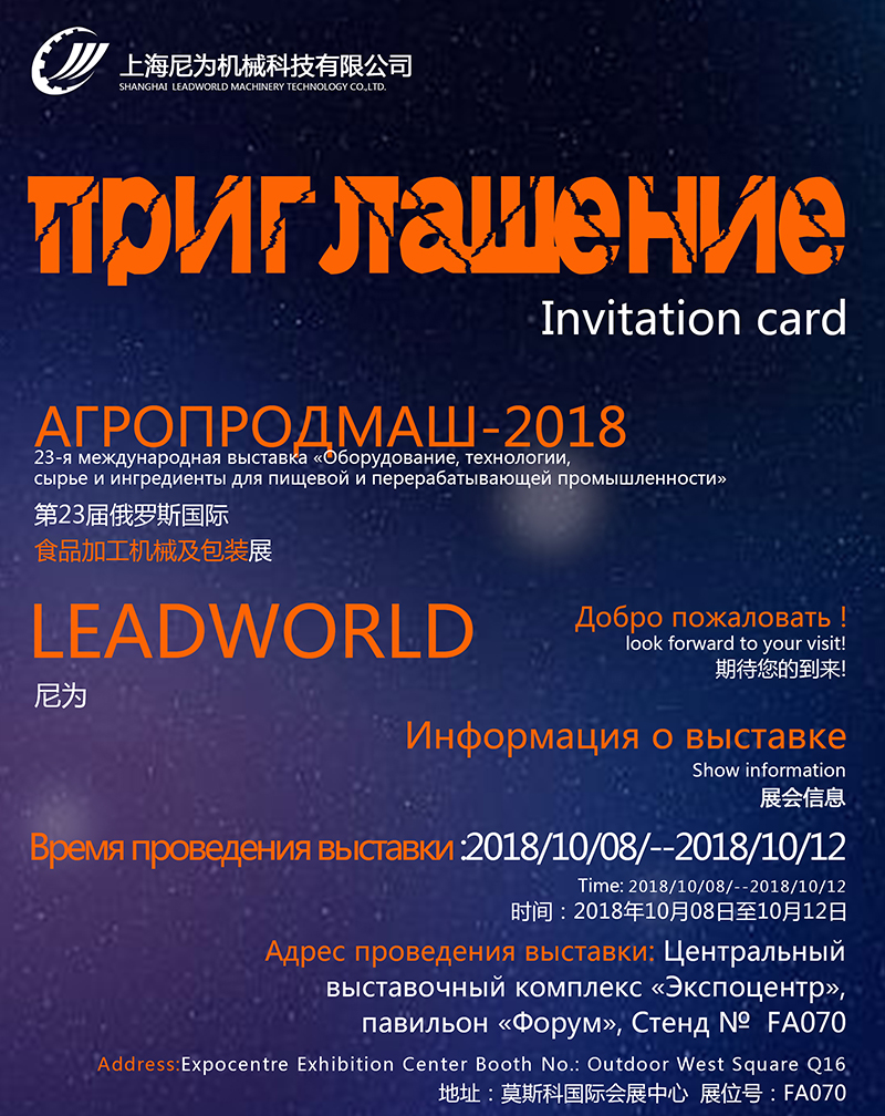 尼為機械誠邀您蒞臨2018年第23屆俄羅斯國際食品加工機械及包裝展-AGROPRODMASH